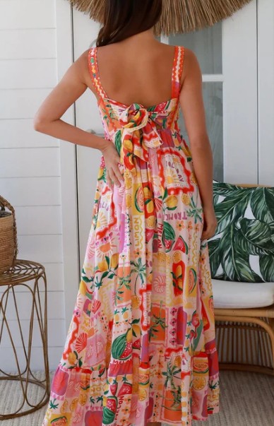 The slip dress features a square neckline, straps with zig zag detailing and statement tie at the back, for a customised fit and playful touch.  The tie at the back completely covers any bra straps.